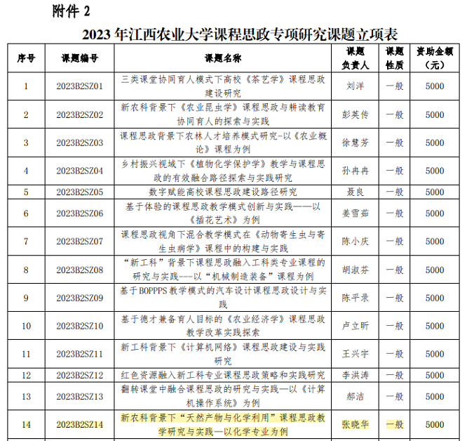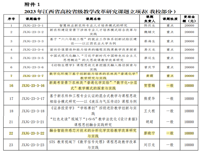 据悉,我校2023 年共获准立项江西省高校省级教学改革研究课题23项(含重点项目9项)。经教务处聘请专家评审,2023年共立项校级教学改革研究校级课题82项(含课程思政专项研究课题20项)。本次获批立项的项目,围绕混合教学、课程思政、教学创新等教育教学研究的关键领域,对于学院教育教学改革创新及专业建设起到积极的推动作用。