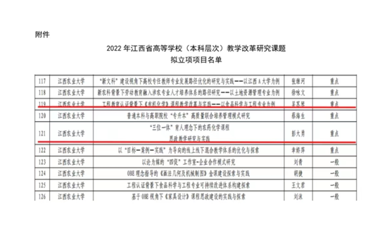 2022年12月初,江西省教育厅公布了2022年江西省高等学校教育教学改革研究重点项目课题(本科层次)评审结果,江西农业大学共获批立项课题26项,其中,重点项目6项。其中,WilliamHill官网吴苏琴老师申报的“工程教育认证背景下《有机化学》课程教学改革与实践——以食品科学与工程专业为例”和彭大勇老师申报的“‘三位一体’育人理念下的农药化学课程思政教学研究与实践”均获得重点项目立项。