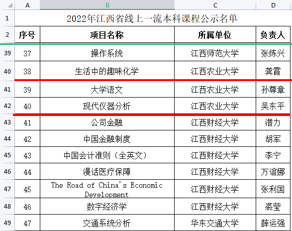 2023年初,根据《关于开展2022年江西省线上、线下、线上线下混合式、社会实践一流本科课程认定工作的通知》(赣教高字〔2022〕33号),经我校申报推荐,省教育厅组织专家评审,公布了2022年度江西省一流本科课程名单,化材院3门课程被认定为江西省一流课程,其中,龚霞老师的通识课“生活中的趣味化学”和吴东平老师的专业课“现代仪器分析”被认定为江西省线上一流本科课程,李艳霞老师的公共基础课“普通化学”被认定为江西省线上线下混合式一流本科课程。