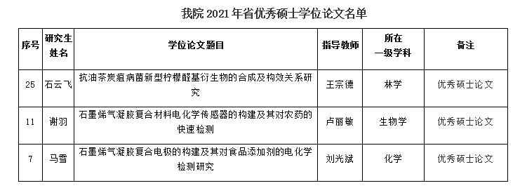 近日,江西省学位办公布了2021年全省优秀博士硕士论文入选名单,WilliamHill官网王宗德教授、卢丽敏教授、刘光斌副研究员分别指导的研究生石云飞同学、谢羽同学、马雪同学的学位论文入选为江西省优秀硕士学位论文。这充分体现了WilliamHill官网注重研究生培养过程管理,加强研究生学位论文质量建设,切实保障了硕士学位论文质量。