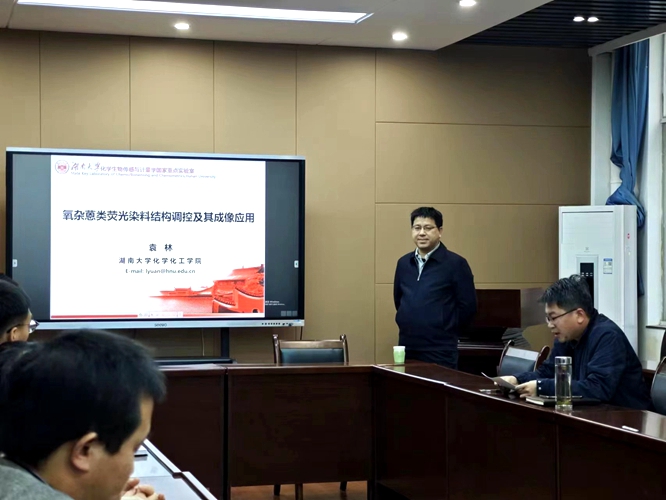 20231124日下午3:00湖南大学化学化工学院、化学生物传感与计量学国家重点实验室袁林教授受邀为化材学院师生作了一场主题为《氧杂蒽类荧光染料结构调控及其传感与成像应用》的精彩报告。报告由副院长卢丽敏教授主持,化材学院部分老师、全体硕士研究生参加此次报告。