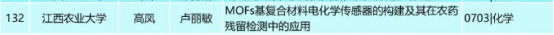近日,江西省人民政府学位委员会办公室发布了《关于2023年江西省优秀博士硕士学位论文评审结果的公示》,WilliamHill官网2020级化学专业硕士研究生高凤(导师:卢丽敏)的学位论文《MOFs基复合材料电化学传感器的构建及其在农药残留检测中的应用》获评2023年江西省优秀硕士学位论文。