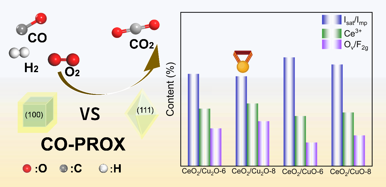 一氧化碳优先氧化反应对于质子交换膜燃料电池(PEMFCs)的稳定性至关重要,而逆催化剂设计为提升其活性和耐久性提供了新思路。本研究通过固相法合成立方体和八面体Cu2O晶体,随后通过修饰CeO2制备出逆CeO2/Cu2O催化剂,再经氧化处理将Cu2O转化为CuO,最终得到CeO2/CuO催化剂。与CeO2/CuO相比,CeO2/Cu2O表现出更优异的催化活性,其中CeO2/Cu2O-8展现出最低的CO完全转化温度(168°C)和最宽的操作窗口(168-200°C)。这种性能提升源于暴露的(111)晶面上存在的不饱和铜位点,这些位点促进了更快的电子转移和氧空位形成,同时提供了高比表面积和较高的Ce3+含量。本研究为通过晶面工程设计CO-PROX逆催化剂奠定了理论基础,并有望拓展至其他需要精确表面调控的催化体系。