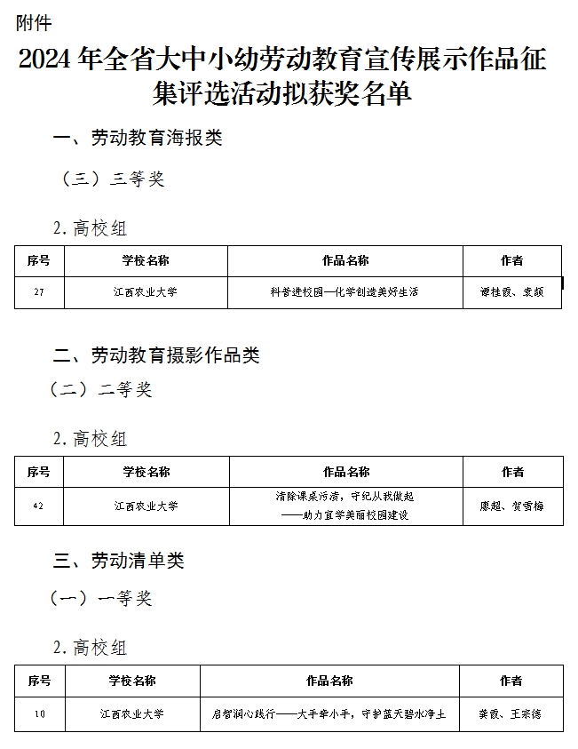 2024年12月20日,江西省教育厅发布了《关于2024年全省大中小幼劳动教育宣传展示作品征集评选活动拟获奖名单的公示》,WilliamHill官网报送的作品在本次评选征集活动中表现突出,荣获劳动教育清单类一等奖1项(全校共4项),劳动教育摄影作品类二等奖1项(全校共1项),劳动教育海报类三等奖1项(全校共3项)。