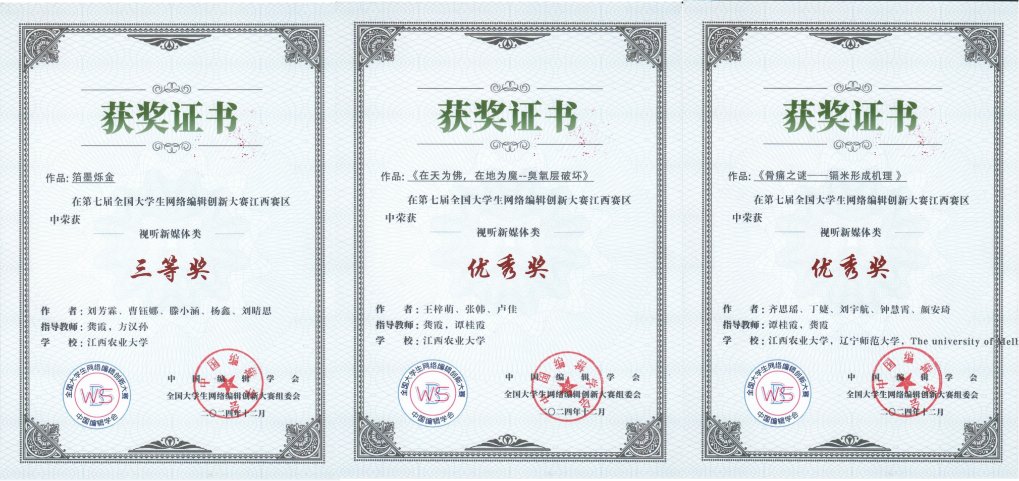 WilliamHill官网教师指导的作品在第七届全国大学生网络编辑创新大赛江西赛区荣获3项奖。由龚霞、方汉孙老师指导的作品《箔墨烁金》获得三等奖;龚霞、谭桂霞老师指导的作品《在天为佛,在地为魔—臭氧层破坏》获得优秀奖;谭桂霞、龚霞老师指导的作品《骨痛之谜—镉米形成机理》获得优秀奖。