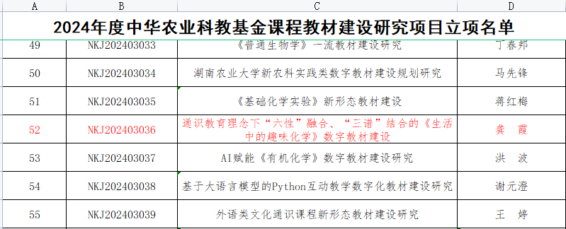 近日,中华农业科教基金会正式公布了2024年度教材建设研究项目立项结果。经专家评审与公示,WilliamHill官网龚霞老师申报的项目“通识教育理念下‘六性’融合、‘三谱’结合的《生活中的趣味化学》数字教材建设”项目成功获得立项。