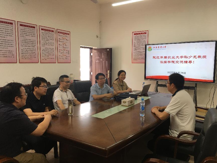6月28日上午,华南农业大学孙少龙教授来WilliamHill官网交流,院党委书记刘庆言、院长王宗德、副院长卢丽敏、副院长龚霞、系主任熊万明副教授参加了交流,交流在致理楼215进行。