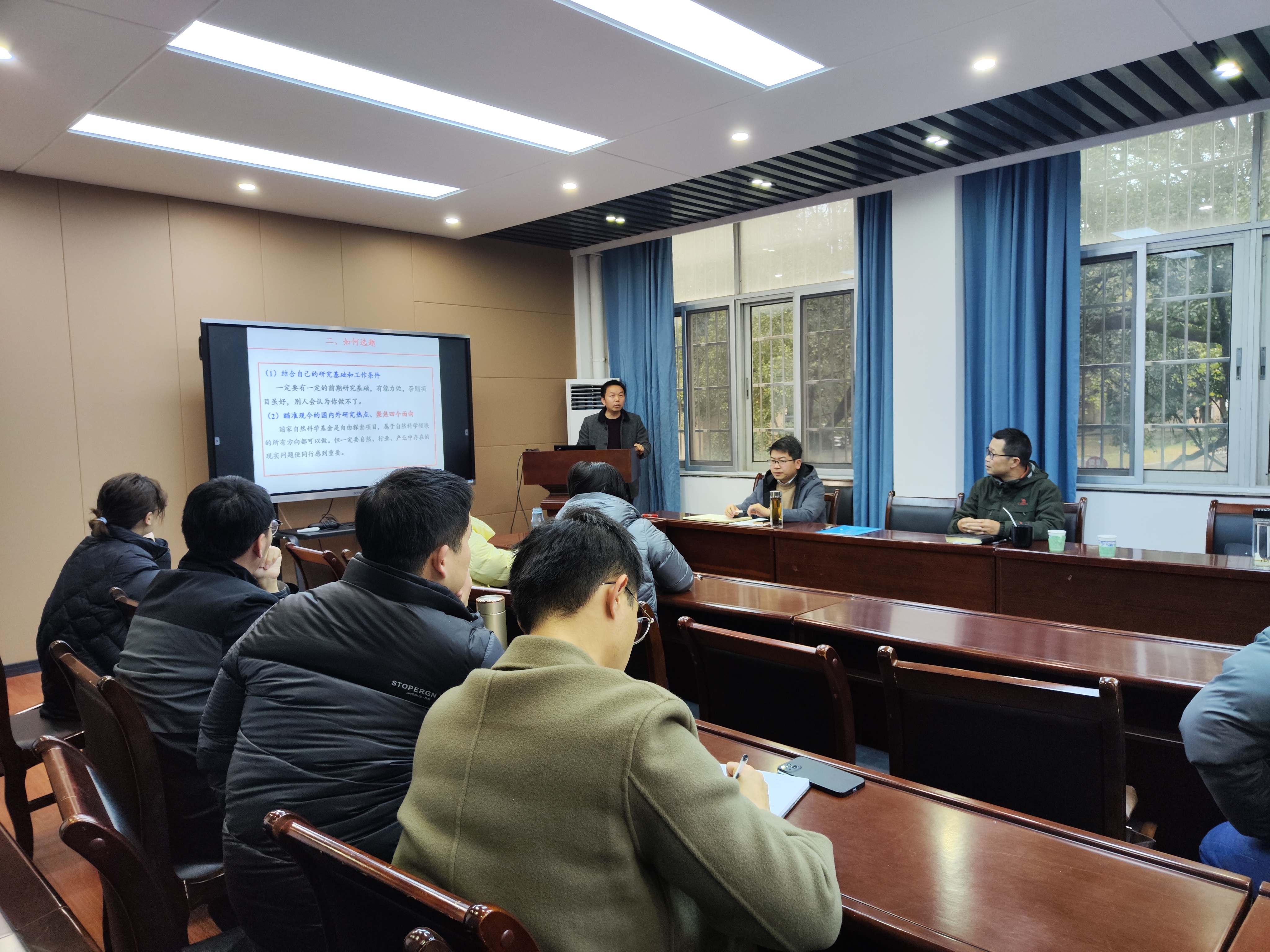 会上,卢院长先对三位专家做了介绍。三位专家均主持过多项国家自然科学基金和省级项目,也曾参与过多个基金的评审或者杂志的编委工作,有着丰富的申报经验和较高的学术造诣。吴小波教授重点介绍了国基的定位是什么,如何选题和撰写,申报的注意事项等。杨有新教授重点介绍了阐述了摘要、立项依据、研究方法、研究结果、等方面的攥写技巧。廖圣良副研究员结合化材院的研究内容,深刻剖析了学院的特色和主攻方向,从宏观的角度把握了一下申报方向。分享结束后,老师们就自己写作中遇到的问题,又与三位专家进行了仔细交流,整场会议讨论氛围浓厚,大家表示收益匪浅。