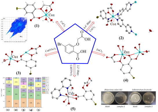 杀菌剂作为农药的重要组成部分,有着悠久的发展历史,占据着广阔的农药市场。杀菌剂长期使用,使其产生了耐药性,失去了高效性。而杀菌剂与金属离子配合形成络合物,不仅可以增强其抗菌活性,而且可以通过缓释长时间抑制细菌,解决耐药问题。基于此,为了研究苯氧乙酸配合物及其生物活性,本文以5-溴水杨酸为原料,将氧乙酸引入羟基,合成5-溴-2-羧基甲氧基苯甲酸(H2BCBA),并以其作为配体与过渡金属离子配位,合成5个过渡金属配合物。通过x-射线单晶衍射、热重分析、元素分析等手段对配合物的结构进行了表征。通过赫什菲尔德表面和指纹图分析了配合物晶体中的分子间弱分子间作用力。详细研究了配合物1 ~ 5的光致发光性能和抗真菌活性。