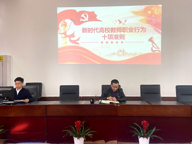 会上,学生党总支书记彭玉萌组织大家学习了《新时代高校教师职业行为十项准则》,集中观看了师德师风警示教育典型案例。
