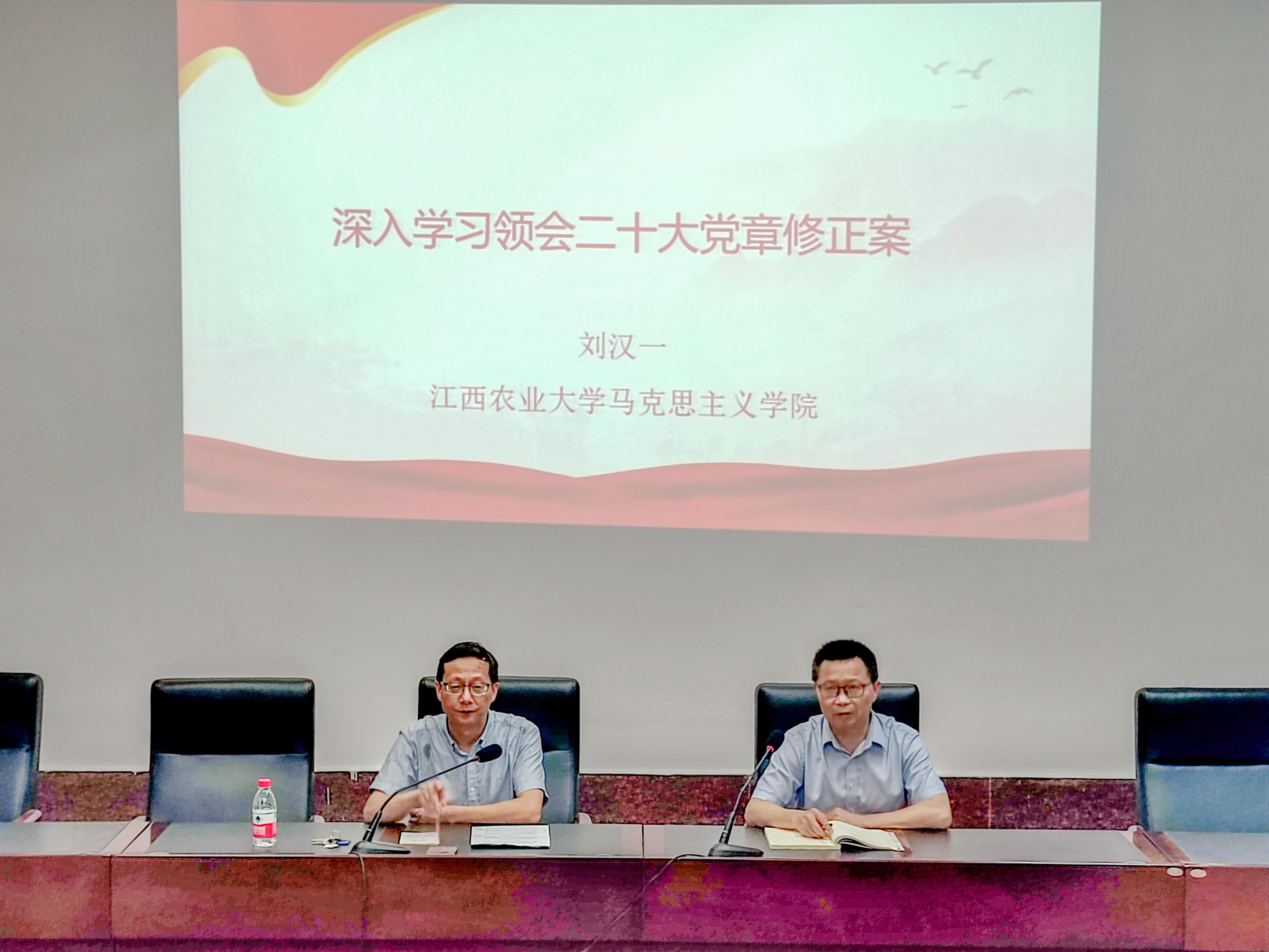 刘汉一以“深入学习领会二十大党章修正案”为题,从“中国共产党章程概述、党章建设的历史进程、二十大党章修正案的主要内容”三个方面对《中国共产党章程》的形成、发展及完善这一历史进程进行了系统性论述,并结合自身多年学习与工作的感受与体会,生动阐述了在一代代共产党人的共同努力下,党章实现“从无至有,从有至善”的重大历史成就。