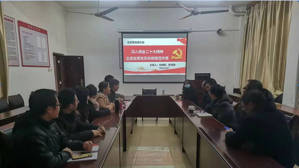 为了深入学习领会党的二十大精神,在新征程上努力开创化学系党支部工作新局面,2022126日下午,化学系党支部召开党的二十大精神主题党日学习会,支部书记贺雪梅为化学党支部上党课,化学系党支部全体党员参加。