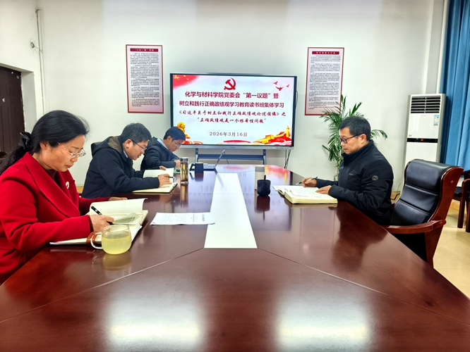 2026年3月16日8:45,学院党委召开会议,开展树立和践行正确政绩观学习教育读书班成立后的第一次集体学习。会议由学院党委书记刘庆言主持,副院长、九三学社社员龚霞及学生党总支书记彭玉萌列席会议。