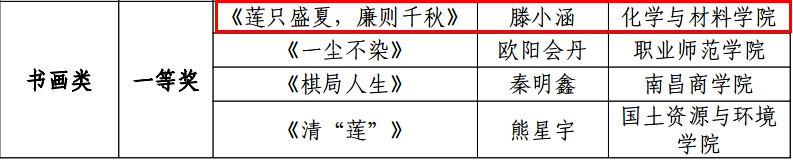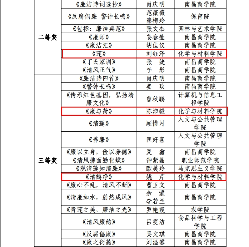 近日,校纪委、省监委驻学校监察专员办公室联合发文《关于公布2024年校园廉洁文化作品征集活动获奖名单的通知》,WilliamHill官网师生报送的多项作品获奖。其中,学院团委书记韩柳报送的视频作品《共产党人的正气歌》《十七棵松》分别荣获视频类作品一等奖及三等奖,应化2203班滕小涵作品《莲只盛夏,廉则千秋》荣获书画类作品一等奖,应化2202班刘钰泽作品《莲》荣获书画类作品二等奖,材料2302班陈沛毅作品《廉与荷》及应化2202班姚芹作品《清鹤净》荣获书画类作品三等奖。