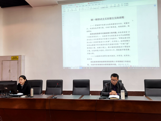 为帮助全体教职工深刻认识形式主义官僚主义的危害,2023112114:00,学院召开教职工大会开展廉洁警示教育。学院全体教职工参会,会议由党委书记刘庆言主持。