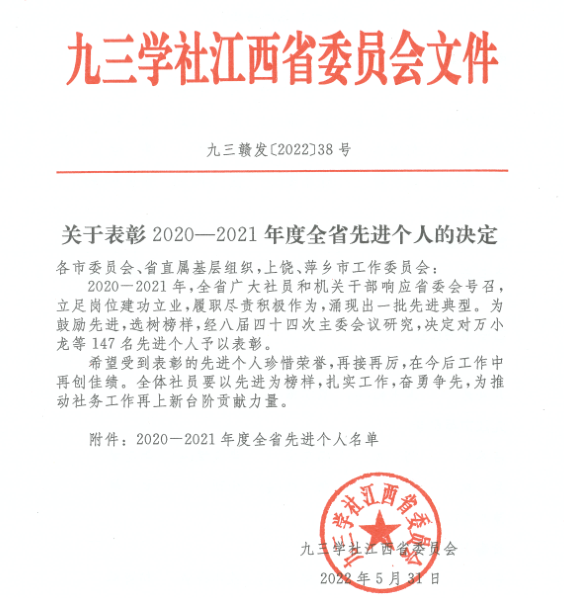 近日,九三学社江西省委印发《关于表彰2020-2021年度全省先进个人的决定》,WilliamHill官网龚霞老师被授予2020-2021年度“全省优秀个人”荣誉称号,龚霞老师也是我校本次唯一获此殊荣的老师。