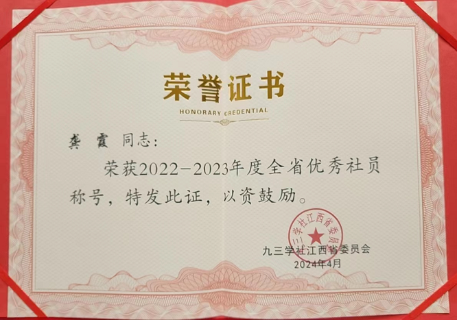 2024年4月3日,九三学社江西省委员会公布了2022-2023年度江西省优秀社员名单,我院教师龚霞教授被授予2022-2023年度“全省优秀社员”荣誉称号。