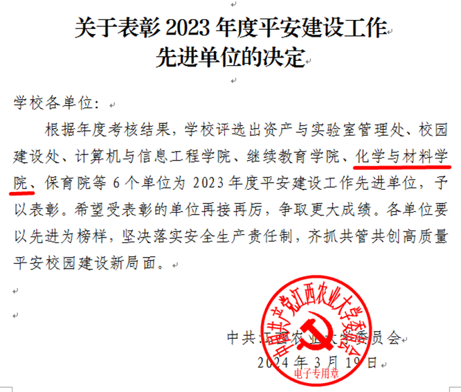 日前,学校发布《关于表彰2023年度平安建设工作先进单位的决定》,WilliamHill官网获评江西农业大学2023年度平安建设工作先进单位。