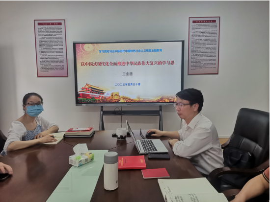 王宗德从什么是“中国式现代化”、“中国式现代化”的本质要求、“中国式现代化”的理论背景和依据、“中国式现代化”的总的战略安排、实现“中国式现代化”必须牢牢把握的准则等五个方面进行了详细阐述。对照“中国式现代化”对学院发展的思考支部党员对学院发展贡献力量,保持党员先进性提出要求。