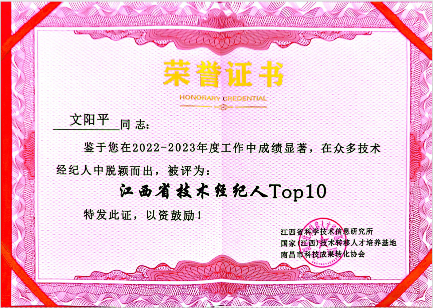 中部六省技术市场联盟发展论坛上,2023年度江西省技术经理人TOP10榜单发布并颁奖,其中,我校青年教授文阳平博士荣获江西省技术经理人TOP10榜首。会上,文阳平分享了他兼职技术经纪人成长与探索之路,通过典型案例分析如何做兼职技术经纪人及其成效,同时从成果需求方、供给方和技术经纪人服务方三个角度指出技术经纪人服务科技成果转移转化存在问题和解决办法,最后提出了“政产研服”四位一体技术经纪人新模式。