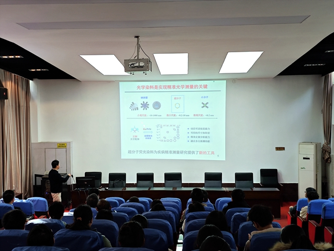 孙教授以重大疾病精准诊治需求为出发点,介绍了荧光成像在生物医学中的应用及荧光分析面临的挑战;提出了基于刚柔并济的策略,设计抗猝灭的超分子荧光探针,实现了病原菌感染的高信噪比检测;基于供/受体改造策略,构建了NIR-II区超分子荧光探针,实现了精细结构的高信噪比成像分析。孙教授生动形象的讲解深深吸引了在座的师生。