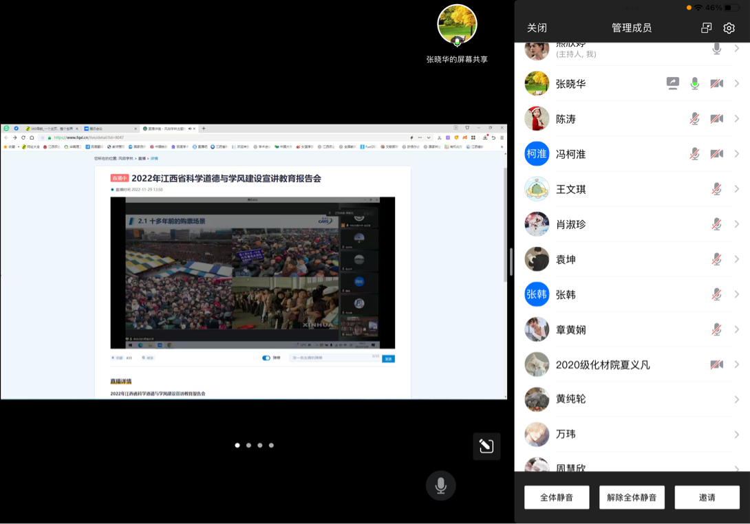 2022年11月29日,为认真贯彻落实习近平总书记关于学风建设和科研诚信建设工作以及研究生教育工作指示精神,引导广大师生和科技工作者弘扬科学家精神,WilliamHill官网研究生支部和研究生分会共同组织研究生在线上观看“2022年江西省科学道德和学风建设宣讲教育报告会”。此次活动由学术部2022级研究生熊欣婷主持,研究生支部张晓华老师及十余名研究生认真观看并进行探讨。