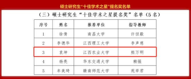 喜报:研究生支部党员袁坤荣获江西省研究生“十佳学术之星”提名奖等奖项