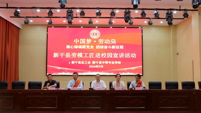 为大力弘扬劳模精神、劳动精神、工匠精神,2024年9月20日,新干县总工会在新干县中等专业学校举办新干县劳模工匠进校园宣讲活动。讲会上,江西省五一劳动奖章获得者黄喜根和吉安市劳模聂志奎分别上台发言,用真挚朴实的语言分享了他们的工作经历和感悟。