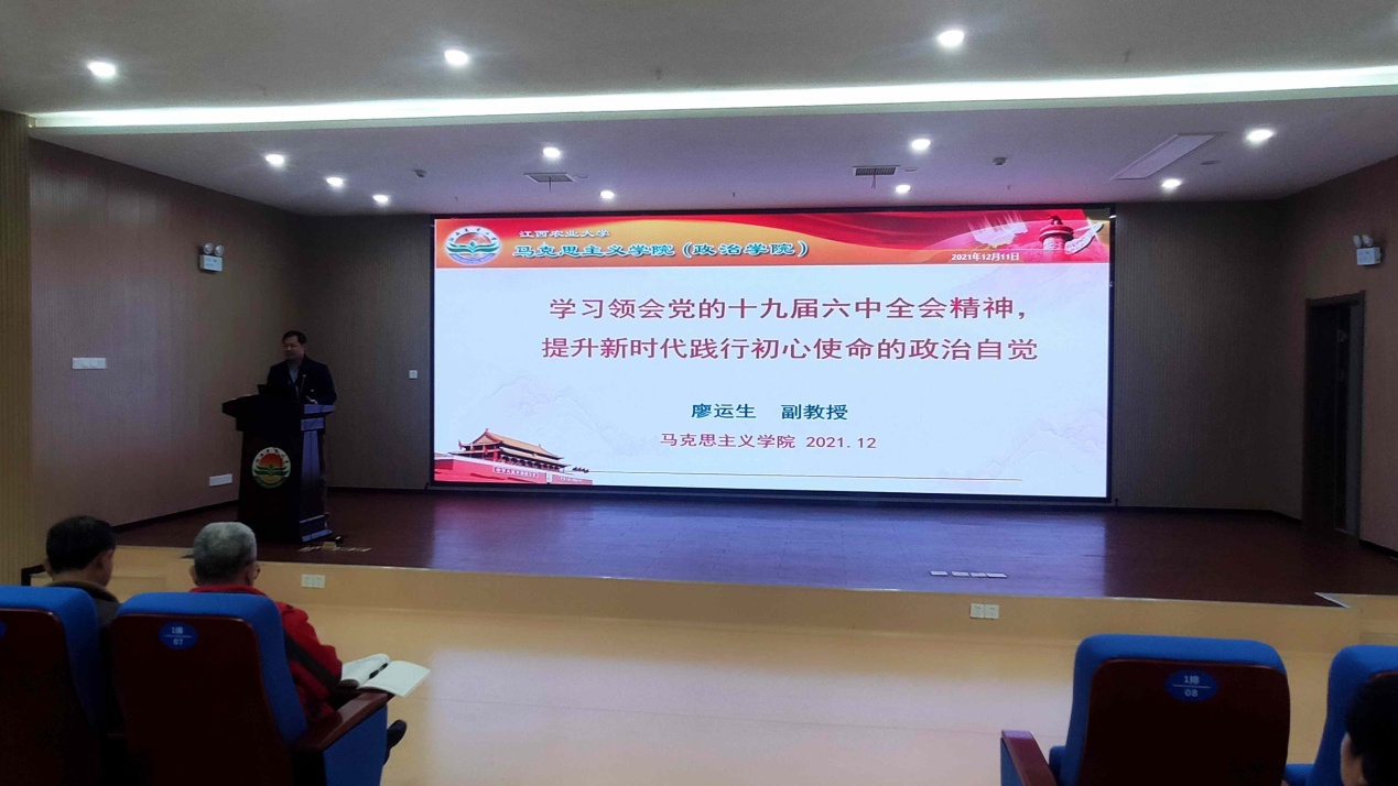 廖运生博士以《学习领会党的十九届六中全会精神,提升新时代践行初心使命的行动自觉》为题,围绕“党的十九届六中全会精神概况”、“《中共中央关于党的百年奋斗重大成就和历史经验的决议》主要内容”、“深入贯彻落实党的十九届六中全会精神”三个方面,对党的十九届六中全会精神做了系统阐释与解读。