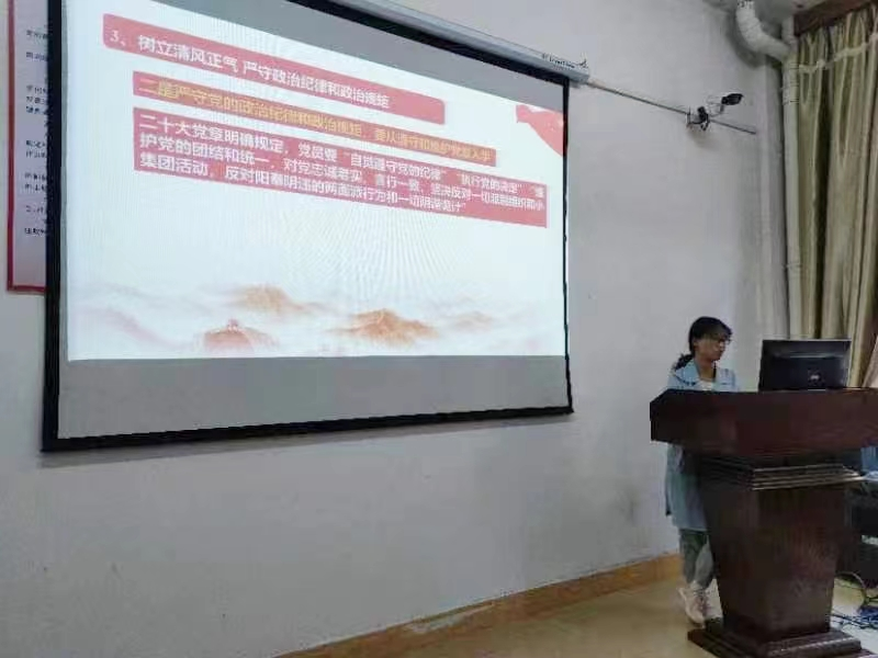 20221112900,学院本科生第二党支部召开党的二十大精神宣讲报告会,学院党委委员、化学系党支部书记贺雪梅应邀作题为《学习贯彻党的二十大精神,争做合格党员》的报告,本科生第二党支部全体党员聆听报告。