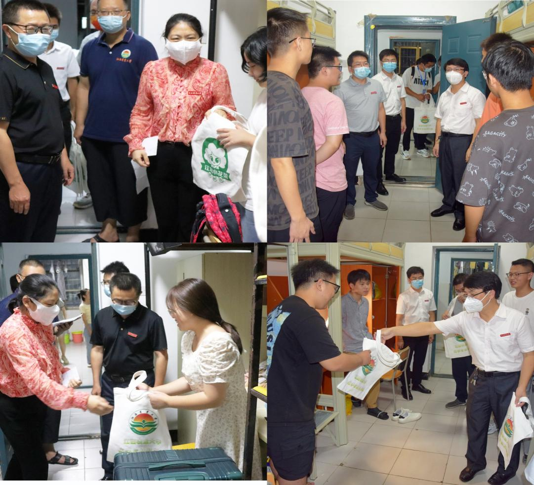 为关心新生的基本情况,体现学院的关心关怀,9月4日晚上,学院领导、新生班主任、学工办老师及班主任助理逐一走访新生寝室。在新生寝室,院党委书记刘庆言与新生进行亲切交谈,详细了解了学生在学习、生活和住宿方面的情况,希望新生能够早点适应大学生活,并就疫情防控、防范电信诈骗、人身和财产安全等方面作了强调。院长王宗德介绍了学院的考研升学情况,并提供了一些学习上的建议,希望新生加强学习,提升动手实践能力。最后,学院领导亲手为每一位新生送上了精心设计、带有学院文化的帆布袋作为纪念品。
