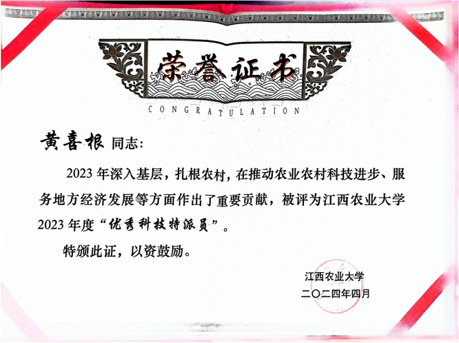 据了解,本次共有20名同志荣获学校2023年度“优秀科技特派员”称号,WilliamHill官网黄喜根教授名列其中,这也是黄喜根教授连续第七年荣获此殊荣。