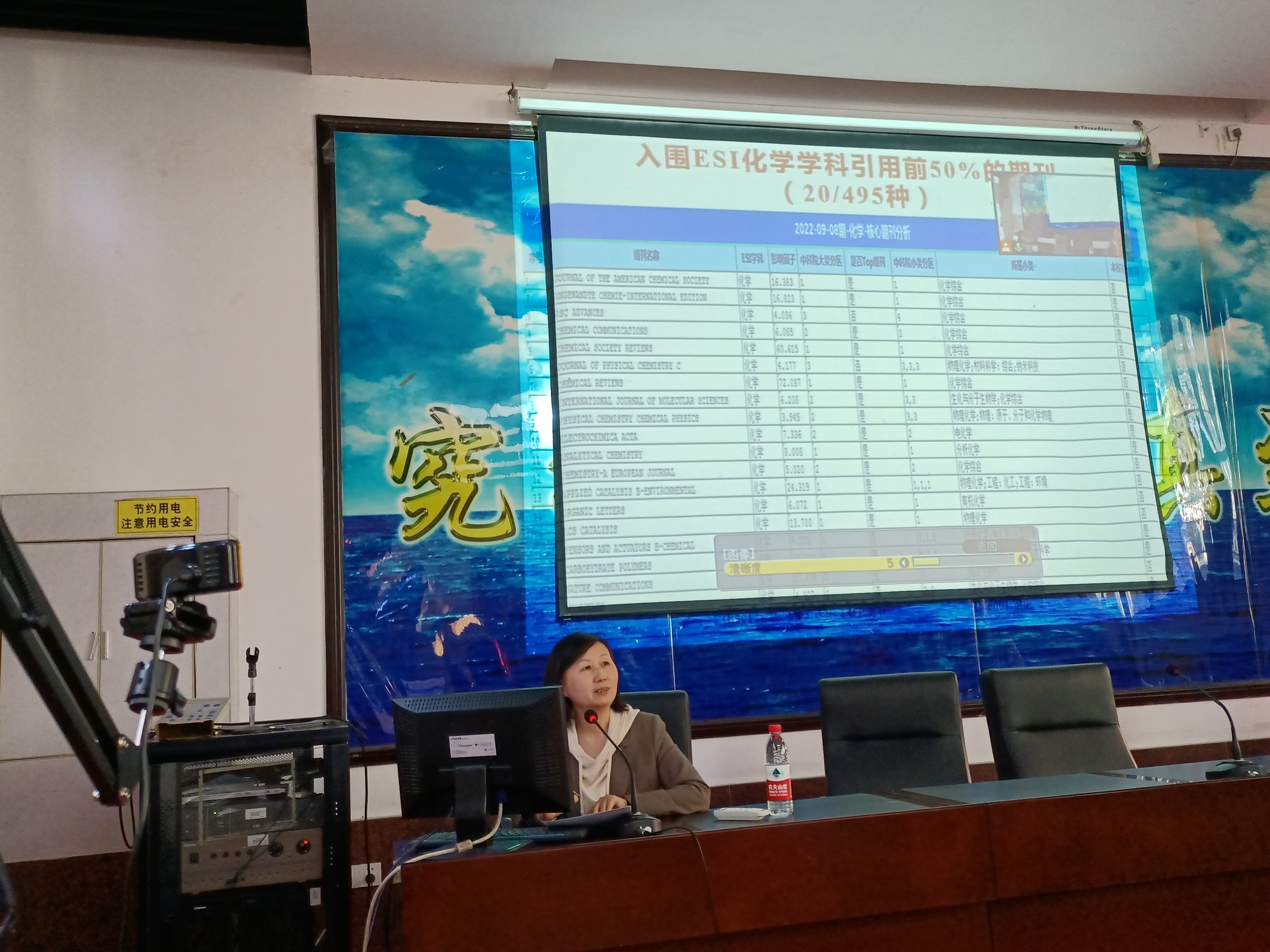 郭韫丽的报告从研究现状、研究前沿、核心期刊和对策建议四个方面对ESI化学学科进行了介绍、对我校ESI化学学科进行了分析,并提出了相关意见和建议。