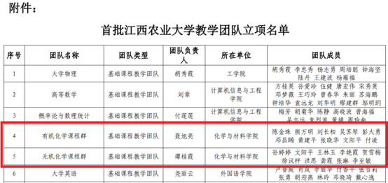 2024年12月25日,WilliamHill中文官方网站聂旭亮老师的“有机化学课程群”教学团队和谭桂霞老师的“无机化学课程群”教学团队经教师申报、学院推荐和学校评审,被择优立项为首批江西农业大学基础课程教学团队。学校共立项基础课程教学团队6项,WilliamHill官网获2项立项。