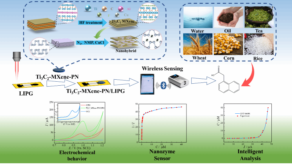 激光诱导多孔石墨烯(LIPG)电极是在聚酰亚胺等商业热塑性聚合物上通过激光直写技术获得,它具有优异柔韧性、良好孔隙率、大比表面积、高电导率、易加工、低成本等优点已逐渐取代传统玻碳电极或金属电极用于柔性化学修饰电极和可穿戴电子器件。磷烯(BP)磷烯非凡性质与独特结构给高性能传感器研究提供巨大潜在机遇,但其制备与应用仍存在稳定性等类石墨烯共性缺陷,MXene作为一种类石墨烯新材料,通过非共价与BP形成纳米杂化物可解决MXene聚集和BP稳定性,同时结合二者优势提升电化学传感性能。基于此,团队开发了高稳定磷烯/MXene自组装纳米杂化物修饰激光诱导多孔石墨烯纳米酶柔性传感电极,结合mini型廉价电化学无线检测设备,通过智能平板,结合机器学习智能算法,实现农业安全即时检测(POCT)智能传感分析。这个工作对类石墨烯复合材料制备及其农业安全POCT传感平台构筑提供理论支撑和实践基础。
