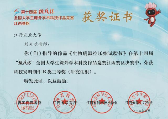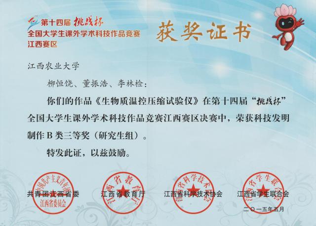 2015年5月31日,由共青团江西省委、省教育厅、省科学技术协会、省学生联合会主办的第十四届“挑战杯”全国大学生课外学术科技作品竞赛江西赛区决赛在南昌航空大学颁奖并闭幕。