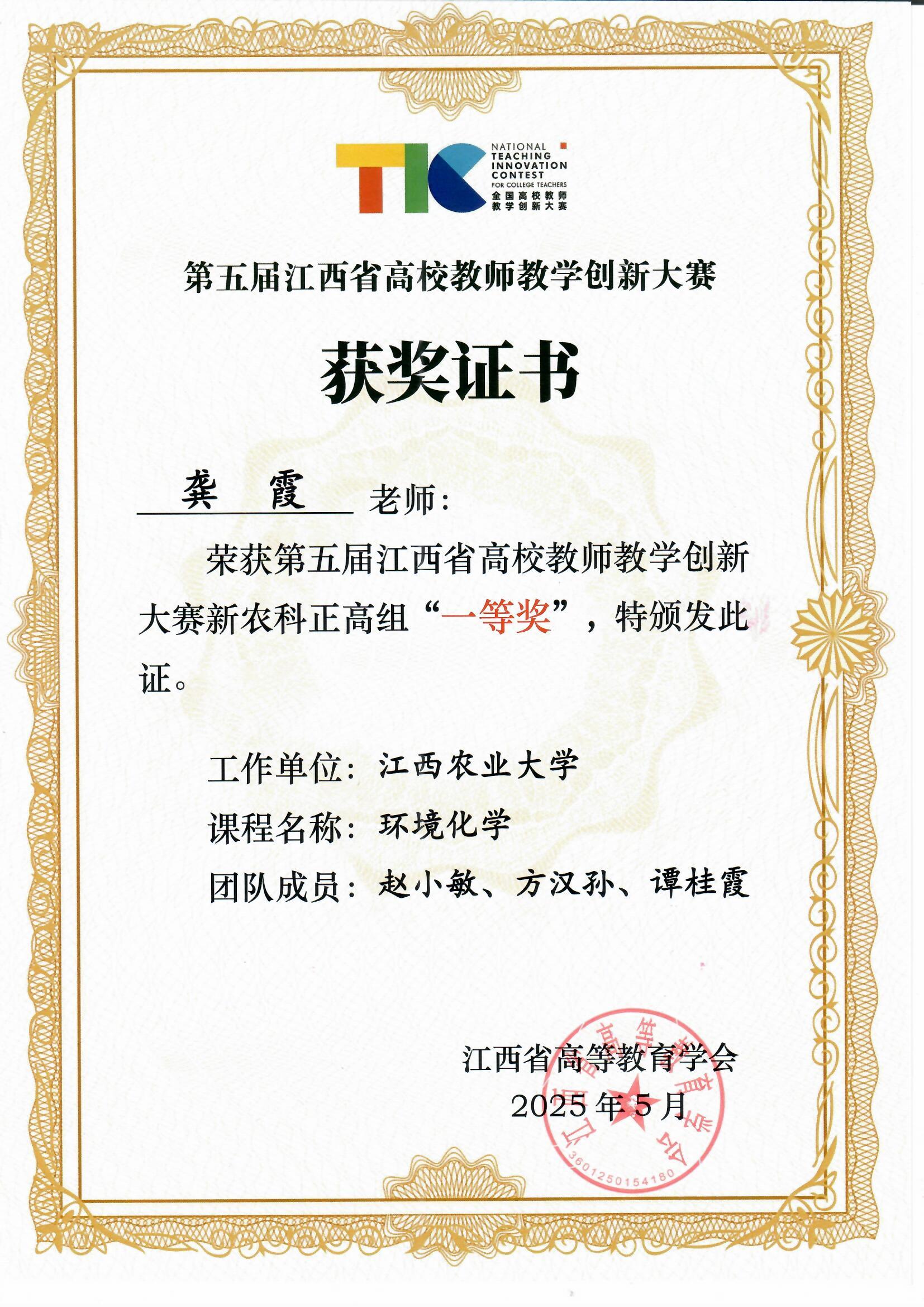 2025年5月,江西省第五届高校教师教学创新大赛结果揭晓,WilliamHill官网龚霞教授“环境化学”教学团队荣获新农科正高组一等奖。
