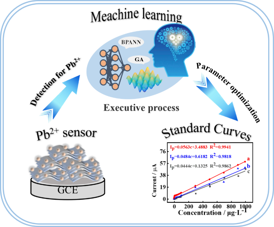 为了解决这一问题,本文提出一种新的机器学习(ML)策略,结合铁酸铋/碳化钛(BiFeO3/MXene)电极材料构建了新颖的电化学传感器用于Pb2+的高灵敏检测。BiFeO3/MXene复合材料具有互连的骨架结构、丰富的活性位点和大表面积,表现出优异的电子导电性和对Pb2+的高富集率。此外,采用正交实验设计(OED)结合反向传播人工神经网络(BPANN)和遗传算法(GA)对支撑电解质pH、BiFeO3/MXene修饰体积、沉积电位和沉积时间等传感器参数进行优化,获得了精确的检测参数,进而提高了该电化学传感器的检测性能。所构建的电化学传感器对Pb2+的检测限低至0.0001 μg·L-1。