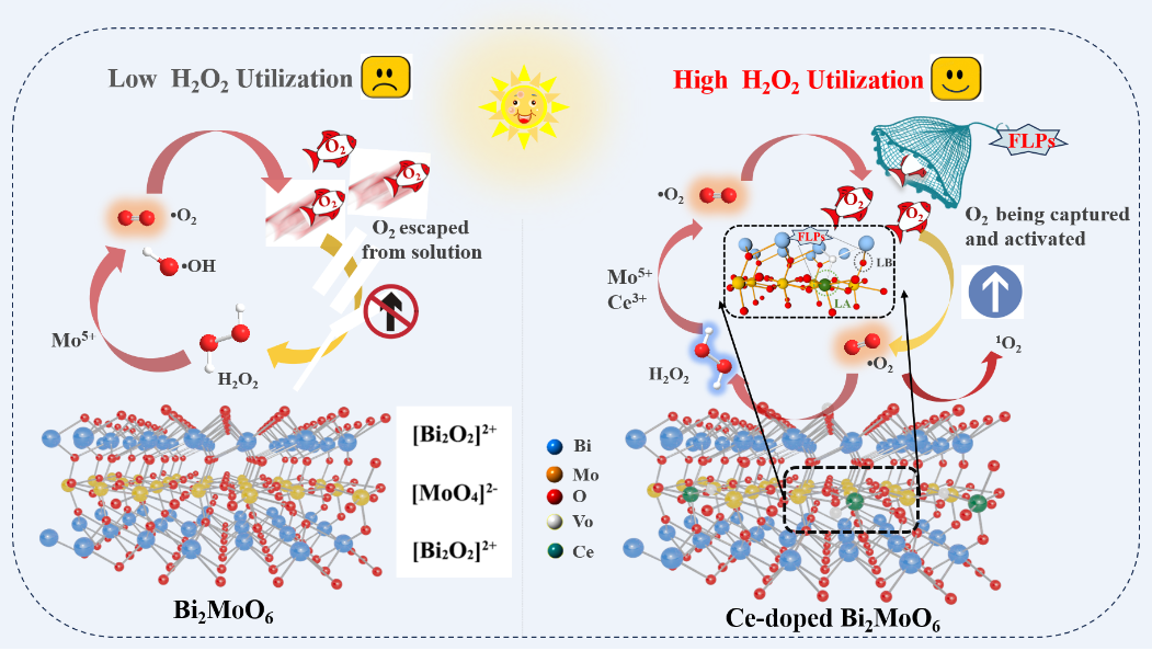 2024年4月10日,WilliamHill官网硕士研究生彭官威以第一作者在TOP二区《Chemosphere》(IF= 8.8)发表题为“Frustrated Lewis pairs created by Ce-doped Bi2MoO6: a universal strategy to promote efficient utilization of H2O2 for Fenton-like photodegradation”的论文。江西农业大学为该论文第一署名单位,卢丽敏教授和谢琰玉博士为共同通讯作者。该研究工作得到了国家自然科学基金、江西省自然科学基金和江西省教育厅基金的支持。