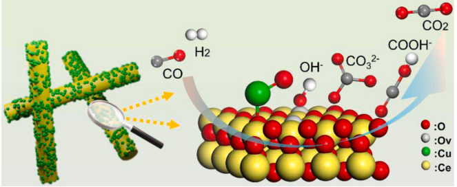 CO优先氧化反应(CO-PROX)是去除质子交换膜燃料电池中残留有毒CO的有效策略,其中氧空位在CO的吸附和活化中起着关键作用。本文利用不同的有机配体,通过水热法合成了一系列由Ce-MOFs前驱体衍生的CuO/CeO2催化剂,并对其CO-PROX性能进行了研究。由邻苯二甲酸(1,3,5-H3BTC)衍生的CuO/CeO2-135催化剂在相对较低的温度(T100%=100 °C)下表现出优异的催化性能和100%的CO转化率,具有宽的反应温度范围和优异的稳定性。优异的催化性能归因于1,3,5-H3BTC前体提供的结构改进和氧空位的促进作用。此外,进行了原位拉曼光谱以验证氧空位对CO吸附和活化的动态作用,而原位DRIFTS分析揭示了CO-PROX反应中的关键中间体,阐明了催化过程的机理。这项工作不仅展示了对用于CO优先氧化的有效CuO/CeO2催化剂的深入了解,也为合成MOF衍生催化剂提供了一种可行的途径。