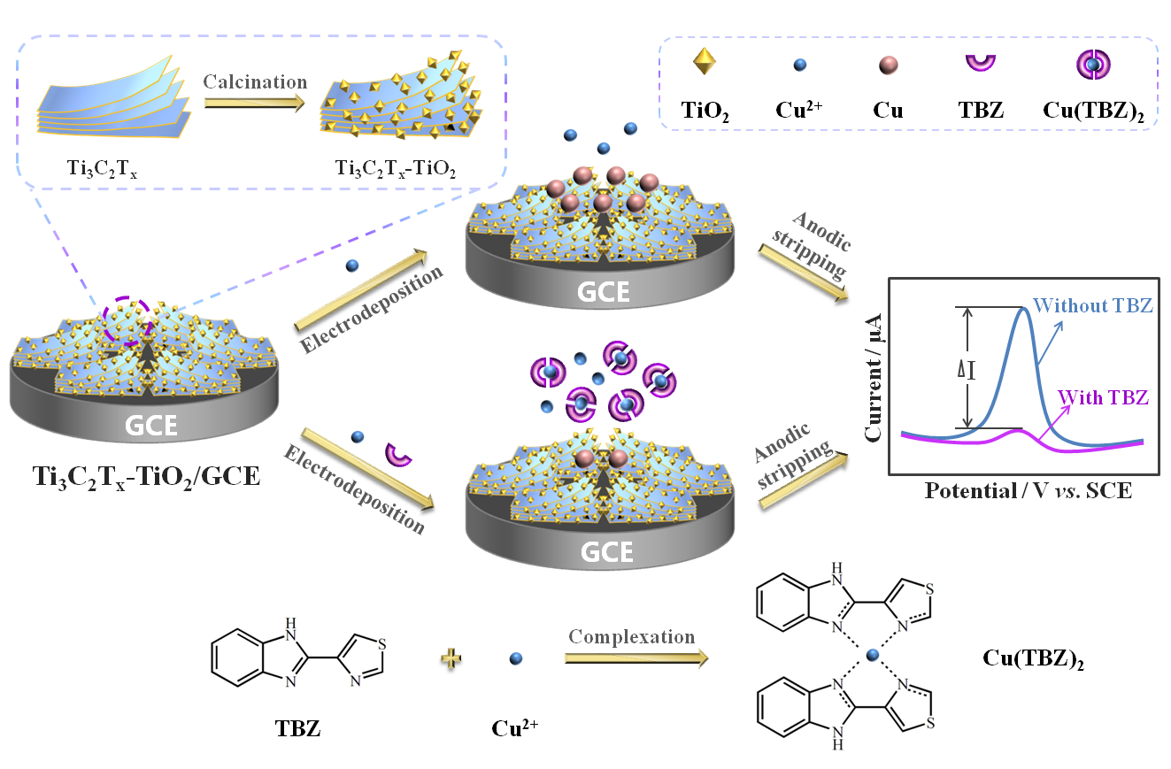 该论文利用溶液中TBZ与二价铜离子(Cu2+)的络合反应引起溶液中游离态Cu2+浓度降低,导致Cu2+阳极溶出峰电流减小,实现了对溶液中TBZ的间接检测。传感体系中,通过制备异质结构的Ti3C2Tx-TiO2修饰电极,提高了Cu2+溶出峰电流的信号强度,实现了对检测体系的信号放大。通过该传感策略,TBZ的检测下限可低至0.1 nM。同时,该传感器也表现出良好的选择性和重现性,并应用于水果样品和环境水样中TBZ的检测。