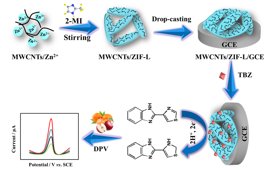 该论文基于二维叶片状多壁碳纳米管/沸石咪唑酯骨架-L (MWCNTs/ZIF-L)复合材料构建了一种新型电化学传感平台,并将其用于噻菌灵(TBZ)的电化学检测研究。2D ZIF-L具有高比表面积、大孔容和丰富的活性中心,对TBZ分子具有很强的富集能力。同时,分散在ZIF-L表面的MWCNTs能显著增强复合材料的电子传输能力,提高TBZ氧化的电催化活性。基于材料组分之间的协同效应,该传感器对TBZ检测的线性范围为0.02-20.0 µmol/L,检测下限为6.0 nmol/L。此外,该方法也实现苹果和柑橘样品中TBZ的检测。