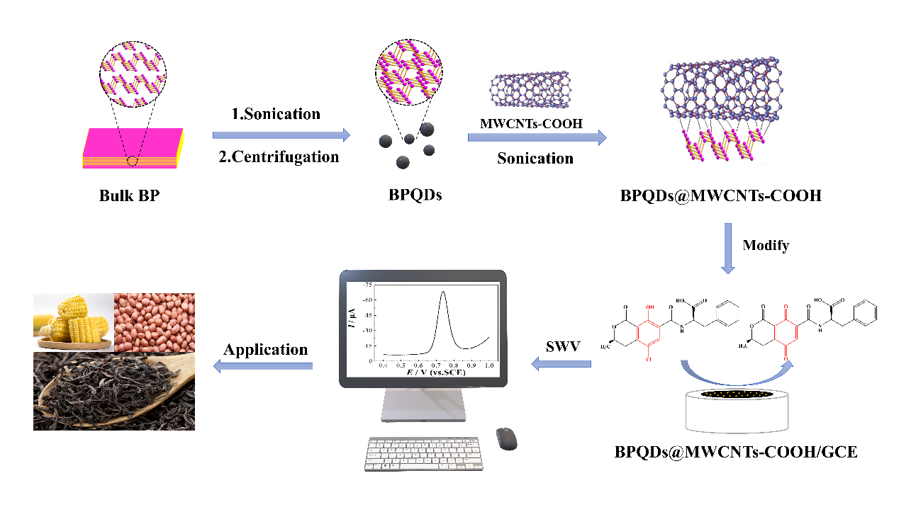 论文通过超声自组装法于玻碳电极表面修饰一层黑磷烯基异质纳米材料,构建了OTA电化学传感识别元件,实现了对多种农产品中OTA的快速抗污染检测;通过密度泛函理论(DFT),物理表征及电化学技术揭示了纳米材料之间协同作用机理以及修饰电极界面对OTA催化响应机制及抗污染机理。该研究工作为OTA电化学传感元件的设计和构筑提供了一定的理论支持。