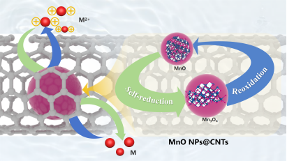 差分脉冲阳极剥离伏安法(DPASV)是检测重金属离子的重要方法。然而,其富集步骤在很大程度上依赖于应用的还原电位,导致传感过程复杂、效率低下。在本研究中,我们提出了一种利用过渡金属的价态循环特性进行重金属离子自还原的无电沉积方法。我们通过简单的一步煅烧工艺,制备了一种由N掺杂的碳纳米管封装MnO纳米粒子(MnO NPs@N-CNTs)组成的电极材料。由于MnO对Pb(Ⅱ)和Hg(Ⅱ)具有独特的还原能力,再加上CNT具有出色的电子传导性,因此Pb(Ⅱ)和Hg(Ⅱ)都能发生自还原,并以Pb(0)和Hg(0)的形式预先集中在 MnO NPs@N-CNTs 表面。此外,MnO NPs上的氧空位(Ov)可促进金属离子的还原,并通过不断提供电子促进价态循环。N-CNT还能防止MnO NPs无效迁移和聚集,确保分析方法的稳定性和可重复性。因此,MnO NPs@N-CNTs电极可检测铅(Ⅱ)和汞(Ⅱ),最低检测限分别为420 ng/L和520 pg/L。这种无电沉积剥离策略为检测天然水样中的多种重金属离子提供了一种有价值的工具。