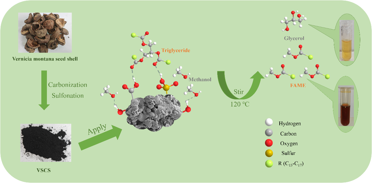 可再生能源因燃料资源和环境问题引发广泛关注。本研究以油桐籽壳为原料,通过直接磺化法制备了一种环境友好的新型催化剂(VSCS),并通过酯交换反应评估其催化性能。为阐明催化剂催化性能与理化结构的关系,对其进行了表征分析。结果显示,VSCS催化剂对三油酸甘油酯和废食用油(WCO)的生物柴油产率均较高(>90%)。该催化剂含有大量稳定的-SO₃H、充足的-COOH,酸量较高。因此,在450℃条件下制备的VSCS催化WCO的生物柴油产率达98.58%;在最优条件(catalyst amount of 9.6 wt.%, WCO/MeOH molar ratio of 1:30, at 120 °C for 8 h)下,产率可达99.70%。此外,人工神经网络(ANN)模型在预测脂肪酸甲酯(FAME)产率方面表现出良好效能,凸显了其在优化反应条件方面的潜力。机理分析表明,含氧基团与磺酸基团的协同作用以及物理吸附的促进,极大地推动了酯交换反应的进行。该酯交换反应的绿色化学指标表明其具有环境可持续性潜力,例如E因子为0.609、原子经济性为90.60%、产率为99.84%、 stoichiometric factor的倒数(1/SF)为0.532、材料回收参数(MRP)为1.000、反应质量效率(RME)为0.621。此外,该催化剂在脂肪酸酯化反应中可能也表现出较高的催化性能。