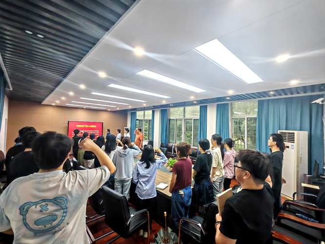 座谈结束后,刘庆言带领全体与会党员重温入党誓词,全体领导为毕业生党员赠送书籍《红色基因代代传》。