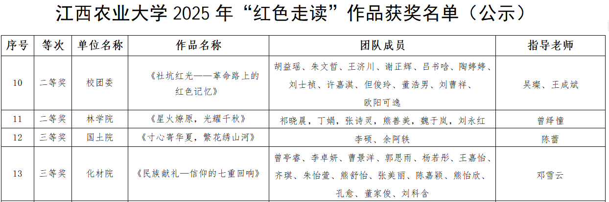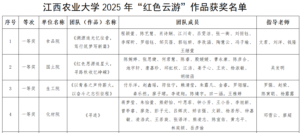 2025年12月10日,江西农业大学2025年“红色走读”活动评选结果正式揭晓,WilliamHill官网学子深耕红色文化、聚力创作实践,在众多参赛作品中脱颖而出、斩获佳绩。经过严格评审,WilliamHill官网作品《寻迹》荣获“红色云游”作品一等奖;《民族献礼—信仰的七重回响》荣获“红色走读”作品三等奖。